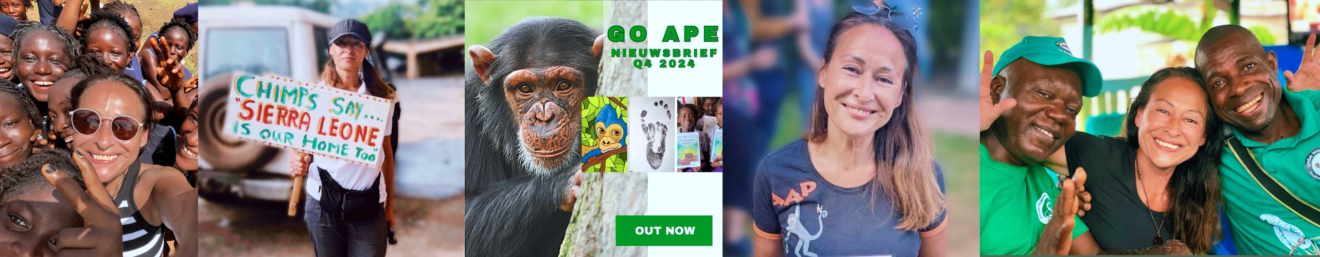 The Go Ape Foundation supports small-scale projects and organizations in Africa & afar, dedicated to the conservation of chimpanzee populations and their habitats. Though based the Netherlands, she spends several months each year in West Africa, visiting the projects supported by her foundation and rolling up her sleeves to assist chimpanzee sanctuaries in various ways, including fundraising efforts.